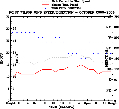 NB: Calculations are based upon 5-minute averages. Wind gusts will be up to 40% stronger. Data is from 2000-2004 (5 Years) The above graph shows the median wind speed (the speed at which half of the time the wind speed is faster, and half the time the speed is slower) in red, and the 75th Percentile wind speed (the wind speed that may be expected 1 in every 4 days) in grey. The most common wind direction is plotted with blue dots. Commentary: